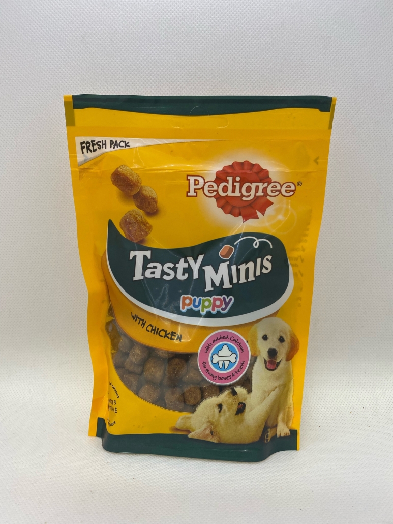 Delicious, soft and chewy, Pedigree Tasty Minis Puppy are scrumptiously tasty little dog treats for puppies. Designed for smaller mouths, these Tasty Bites Chewy Cubes are the perfect way to treat, reward or train puppies. Pedigree Tasty Minis Puppy treats contain added calcium to support the development of strong teeth and bones. These small bites Pedigree puppy treats, with added dietary fibre, promote healthy digestion, supporting puppies’ tummies too, plus there’s Omega 3 to help keep them fit for life and vitamins and minerals to help maintain natural defences and vitality.
